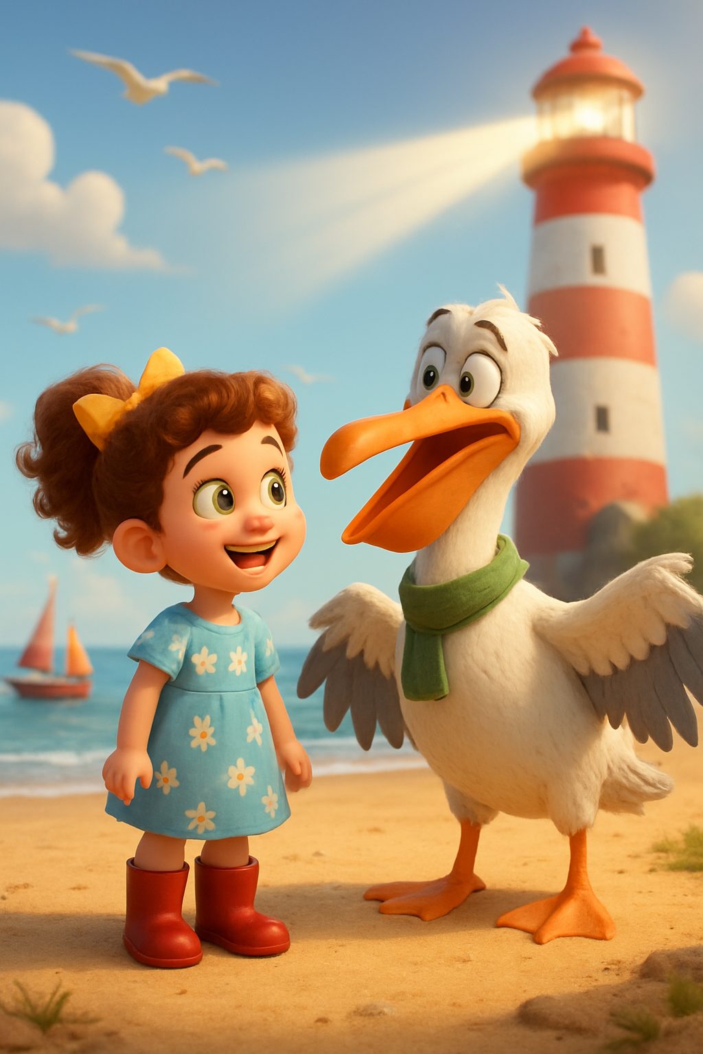 Lily loved the lighthouse! One sunny morning, she heard a loud thump. Who could it be? She peeked up and spotted Perry the clumsy pelican!
