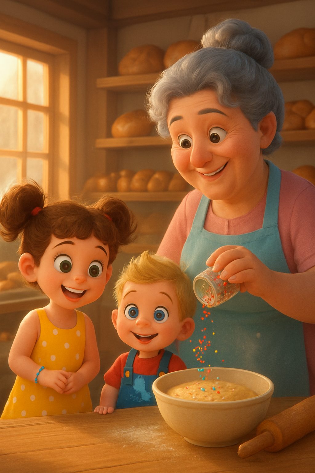 Mabel and Peter rushed into the bakery, giggling. They watched Mrs. Baker mix the dough for her famous bread, but wait — what are those rainbow sprinkles?