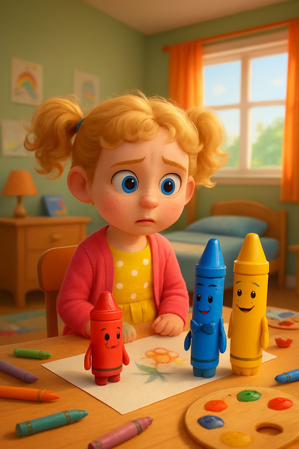 Ella sat at her desk, ready to create. But her crayons had other ideas! Red folded its little arms, Blue puffed up, and Yellow sighed loudly.
