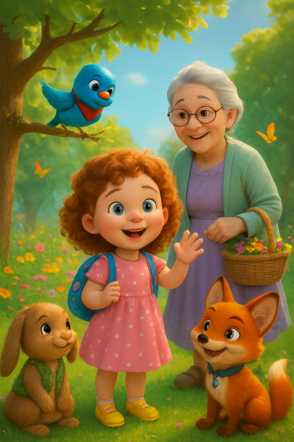 - Emma — little girl: A small girl with curly auburn hair, bright blue eyes, and a sprinkle of freckles across her nose. She wears a soft pink dress with white polka dots and bright yellow shoes. Emma carries a tiny, handmade blue backpack decorated with colorful patches of her favorite animals.