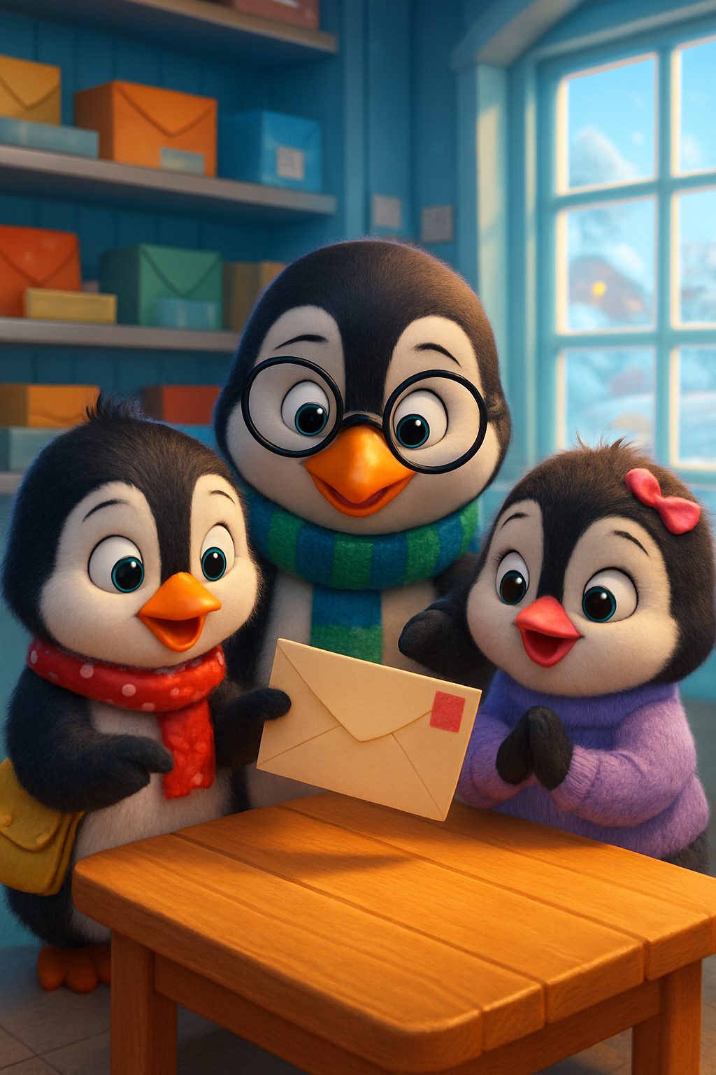 Scene 10: Back at the post office, the penguins sent the whale a special letter of thanks. They felt happy and warm inside.