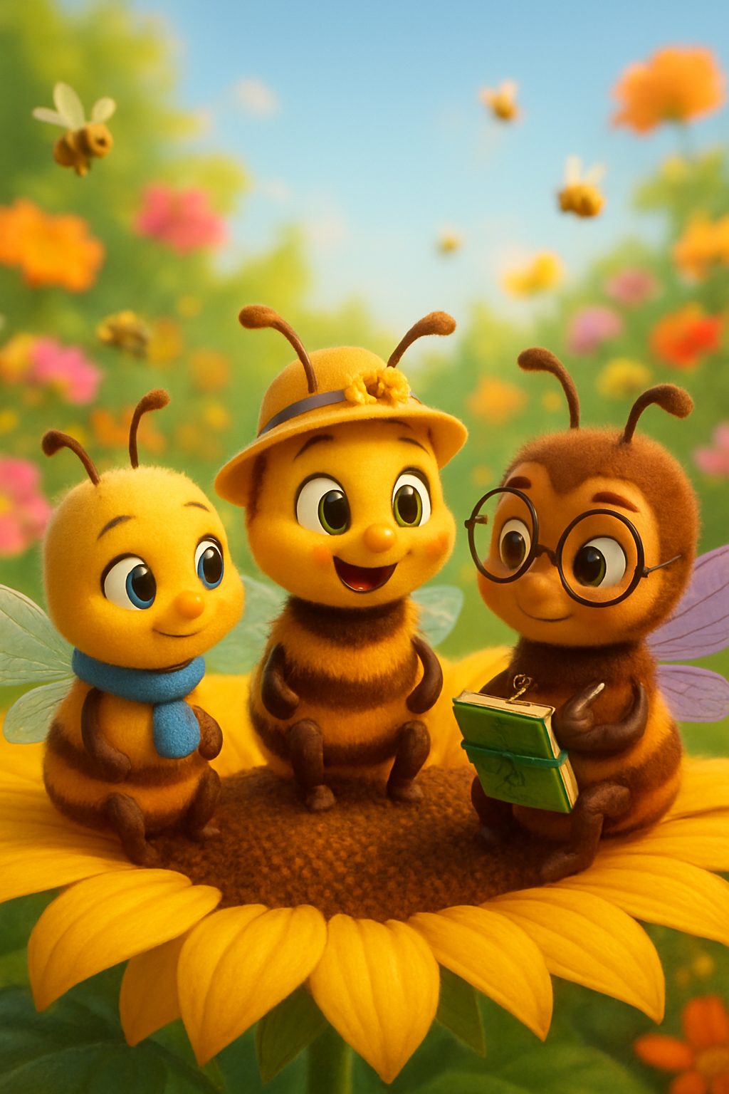 - Flora — knowledgeable bee: A wise bee with deep brown stripes and shimmering violet wings, who wears tiny round glasses perched on her nose. Flora has warm hazel eyes and carries a small notebook tied with a green ribbon, always ready to jot down her honey discoveries.