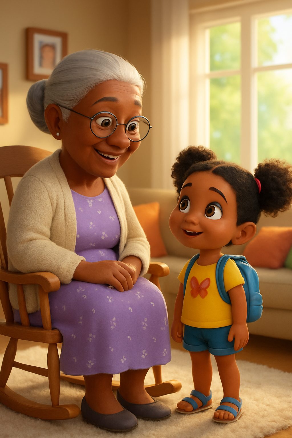 - Grandma Lily — elderly woman: A gentle grandmother with silver hair pulled back into a neat bun, warm brown skin, sparkling green eyes, and a joyful smile. She wears a flowy lavender dress with tiny white flowers, a cozy cream cardigan, and round glasses that sit low on her nose. Grandma Lily has a love for storytelling and a twinkle in her eye.