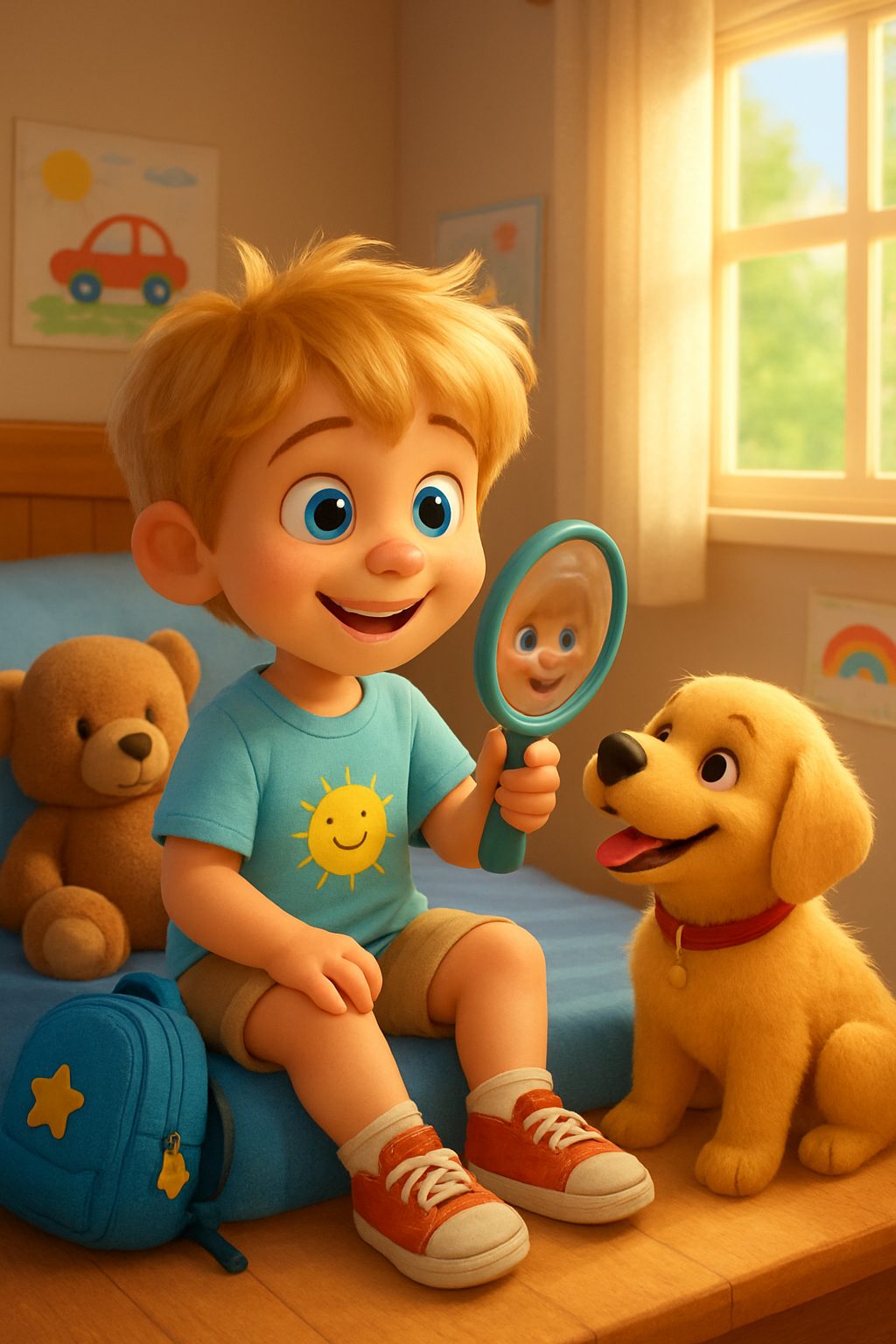 - Max — little boy: A cheerful little boy with tousled sandy-blond hair that shines in the sun, bright blue eyes that sparkle with wonder, and a sprinkle of cute freckles across his nose and cheeks. He wears a light blue t-shirt with a smiling sun printed on it, soft beige shorts, and vibrant red sneakers. Max often carries a small, well-loved blue backpack with a yellow star keychain attached.