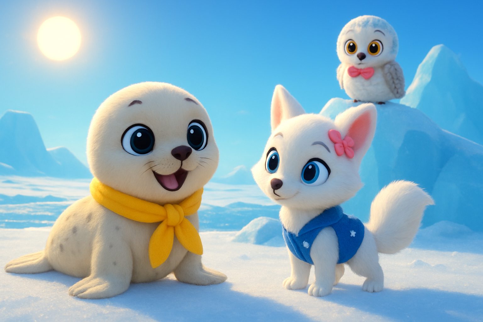 Setting: A bright, sparkling arctic landscape on a sunny morning, with glistening snow, glimmering icebergs, and the distant sound of playful winds howling through the frosty air.