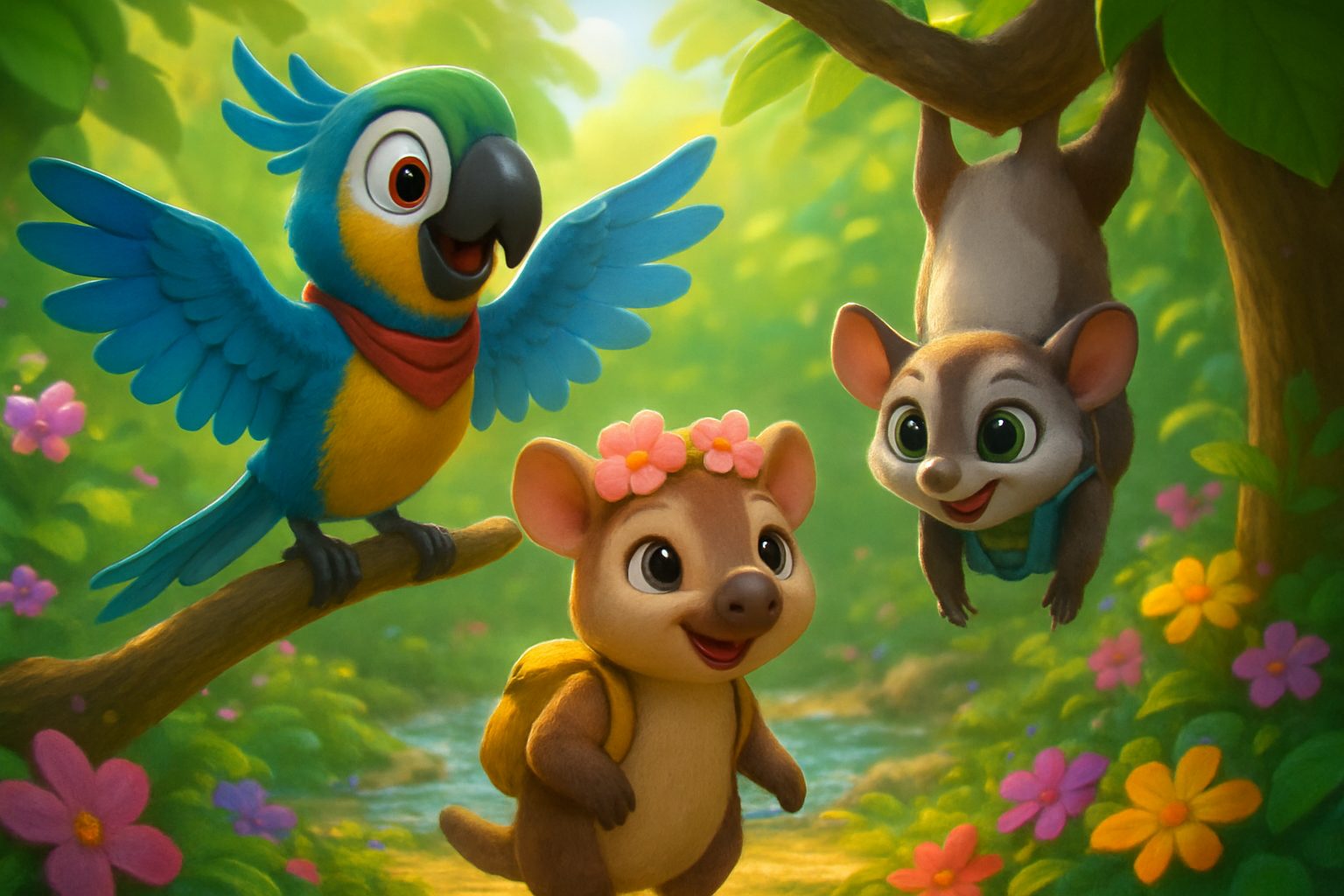 Scene 1: Tico the macaw, Lulu the tapir calf, and Zara the sugar glider giggled by the stream. "What adventure will we find today?" asked Lulu, her eyes sparkling.