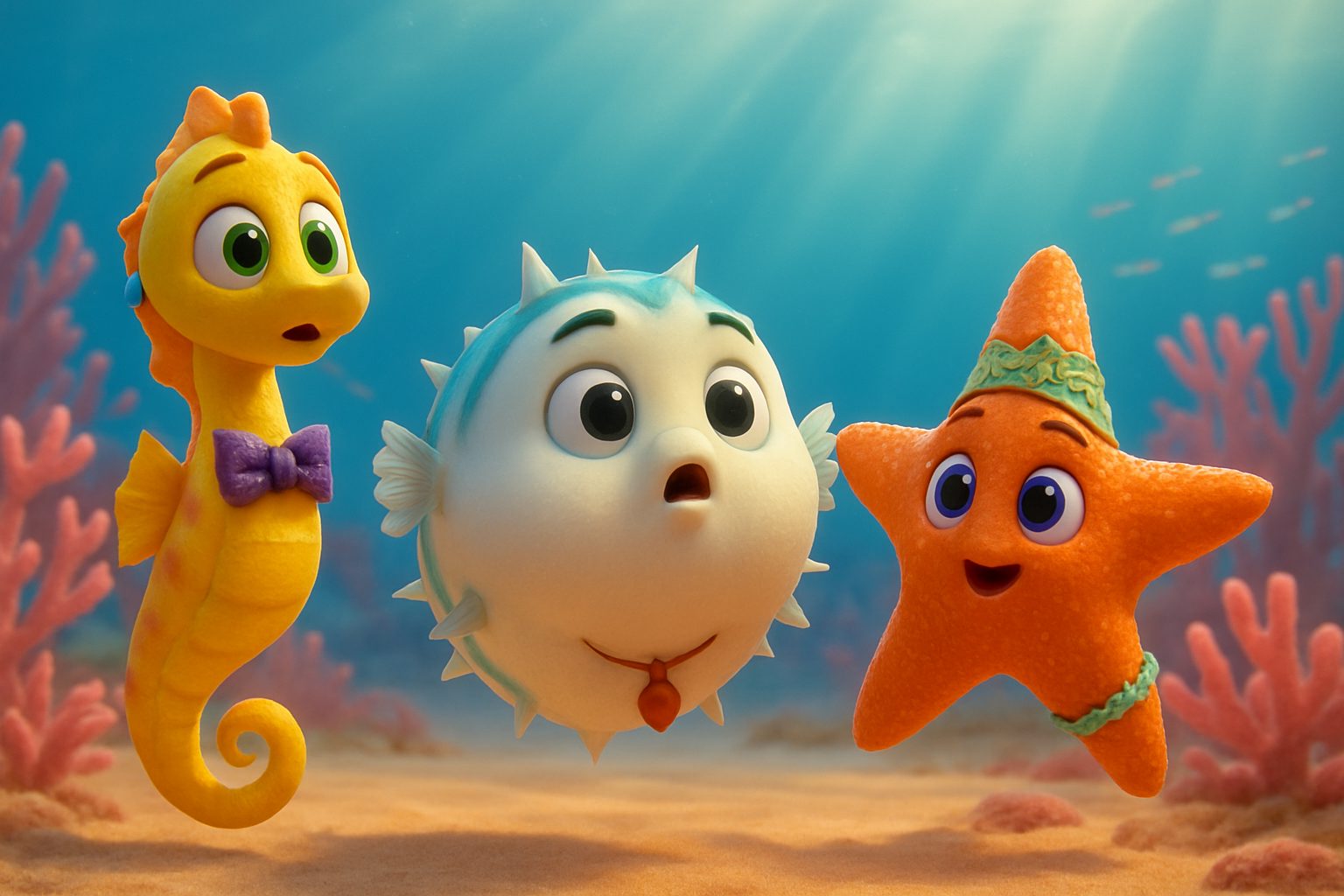 - Finley — seahorse: A slender curled yellow seahorse with orange polka dots, emerald green eyes, a tiny curled tail, wearing a woven purple seaweed bowtie and a single shimmering blue pearl earring
