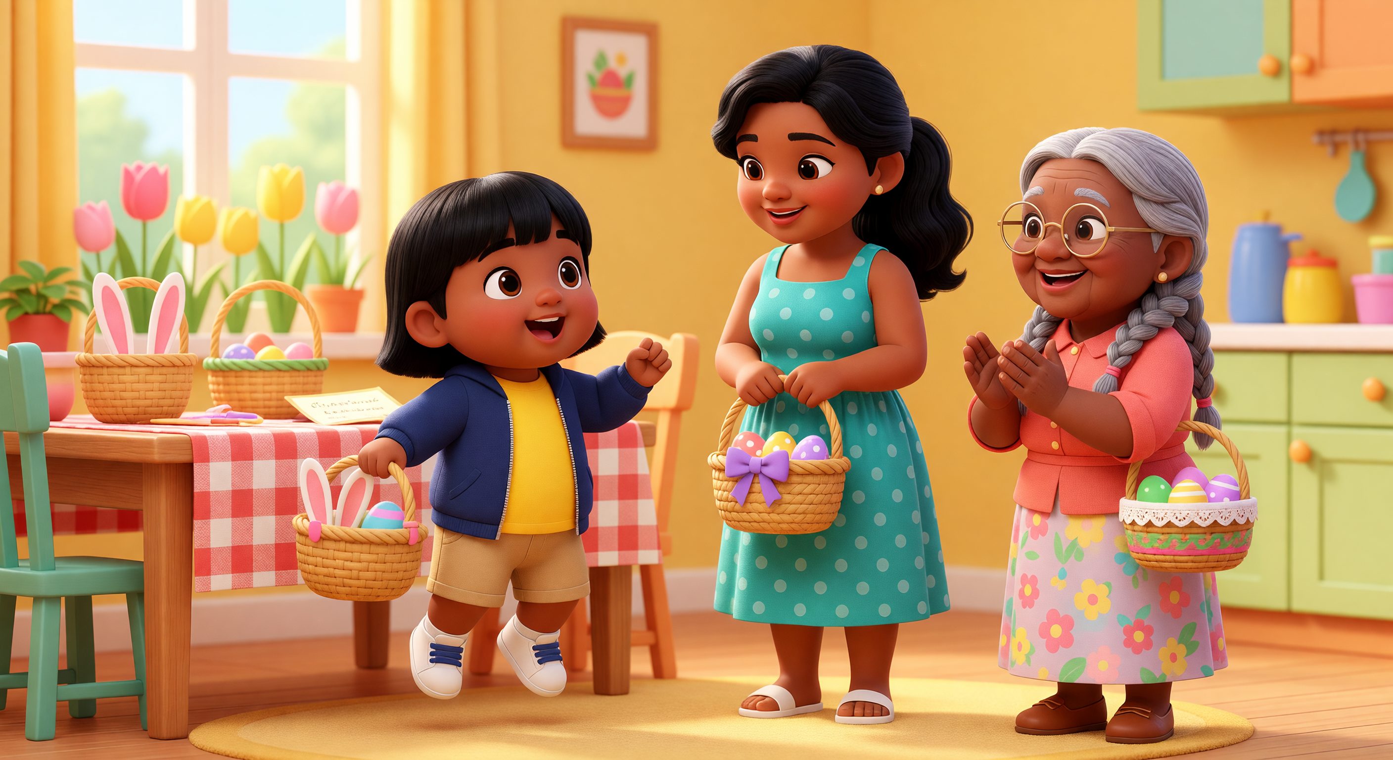 Scene 1: Kai wakes up on Easter Sunday. He sees colorful baskets on the table! 'Look, a note from the Easter Bunny!'