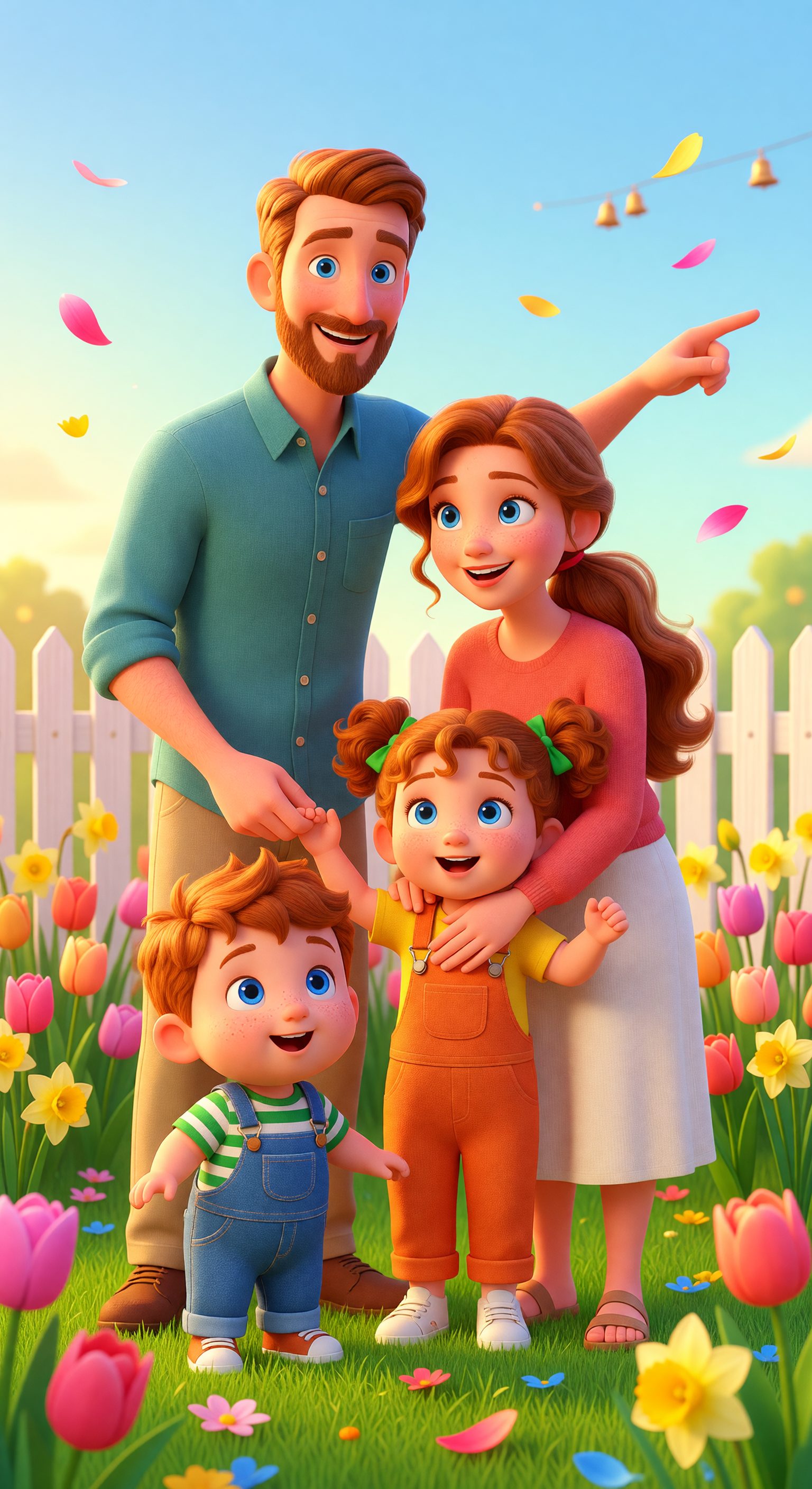 Setting: A charming spring village on a bright Easter morning, with blooming tulips and daffodils lining cobblestone paths, cheerful church bells ringing from afar, and soft sunlight warming the colorful rooftops