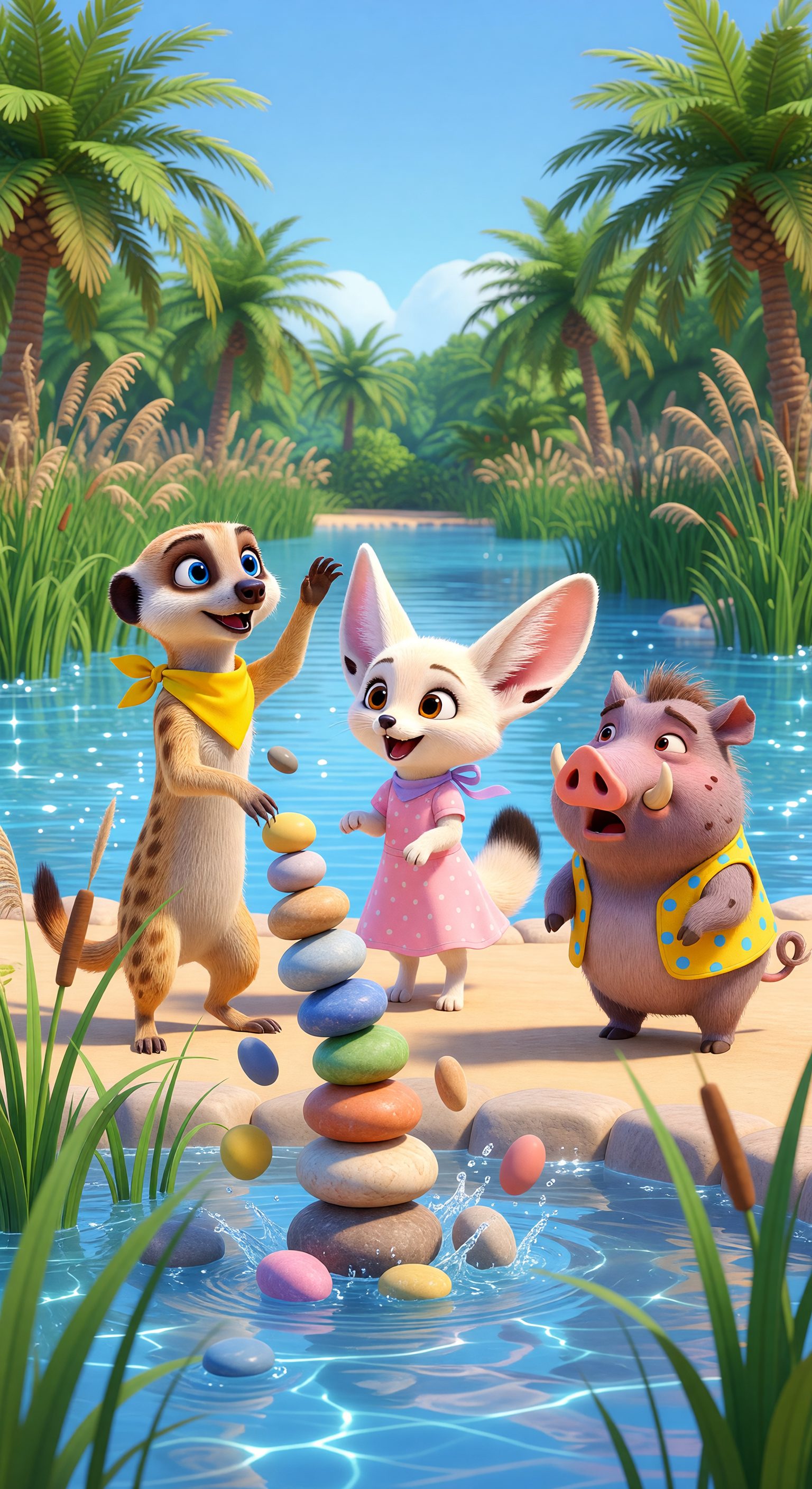 Scene 1: Miko, Fina, and Wuzzy stacked shiny pebbles high at the oasis. 'Our tower will be the tallest!' cheered Miko, standing extra tall. Oops! It tumbled with a clatter!