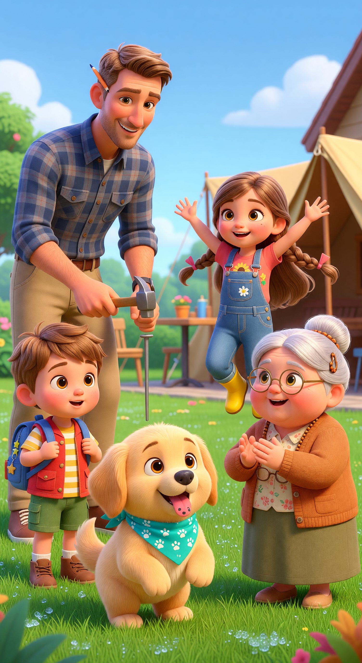 - Jack — father: A tall, athletic father with light fair skin, short neat sandy-brown hair like his children, warm hazel eyes, light stubble on his jaw, and a friendly wide smile. Wearing a navy-blue plaid flannel shirt with rolled-up sleeves, khaki pants, brown leather belt, and rugged canvas sneakers. Has a pencil tucked behind his right ear.