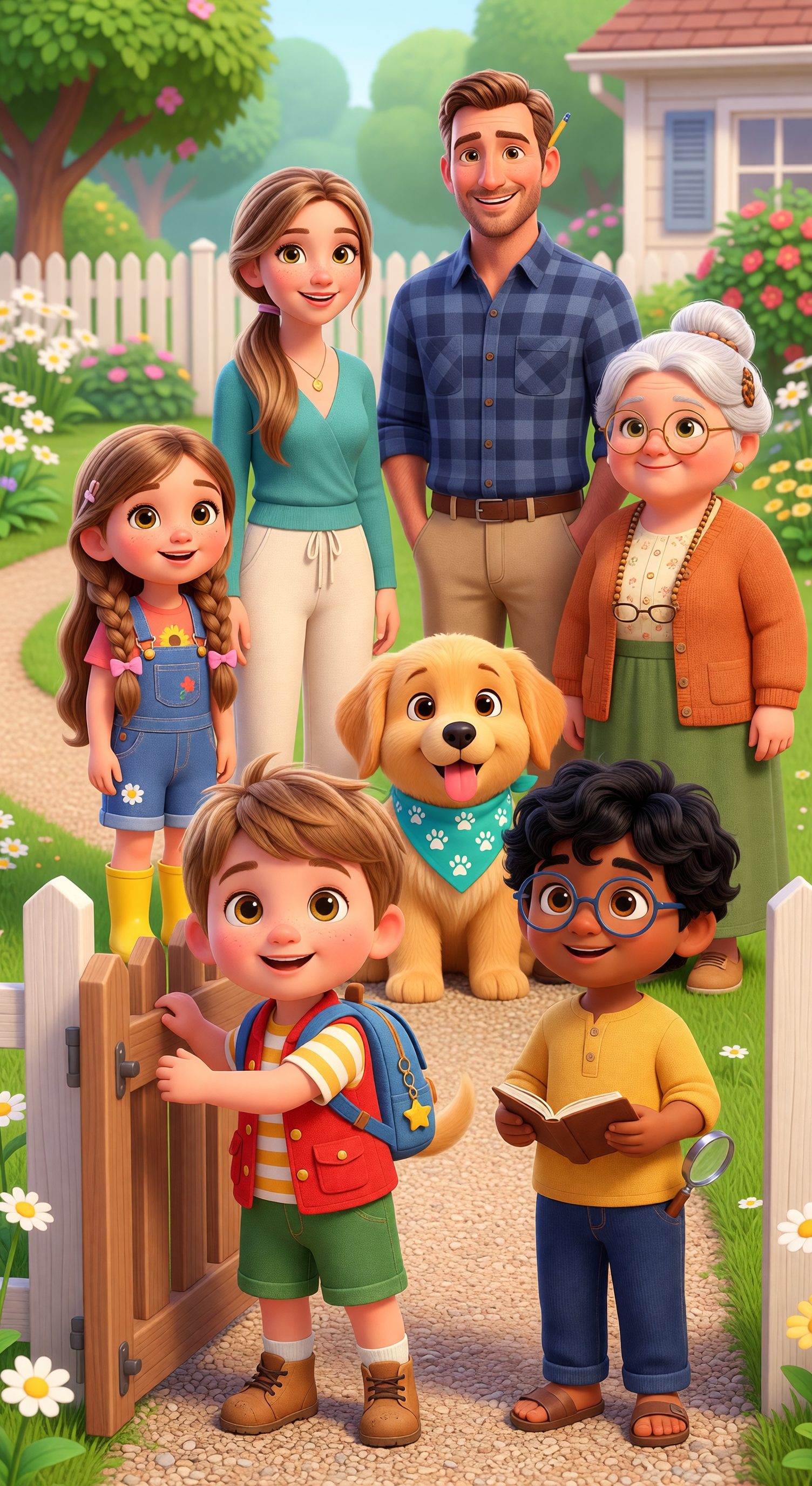 Scene 1: Knock knock! Ravi runs up with his magnifying glass and homemade bug journal. Caleb cheers, eyes wide. The family waves hello.