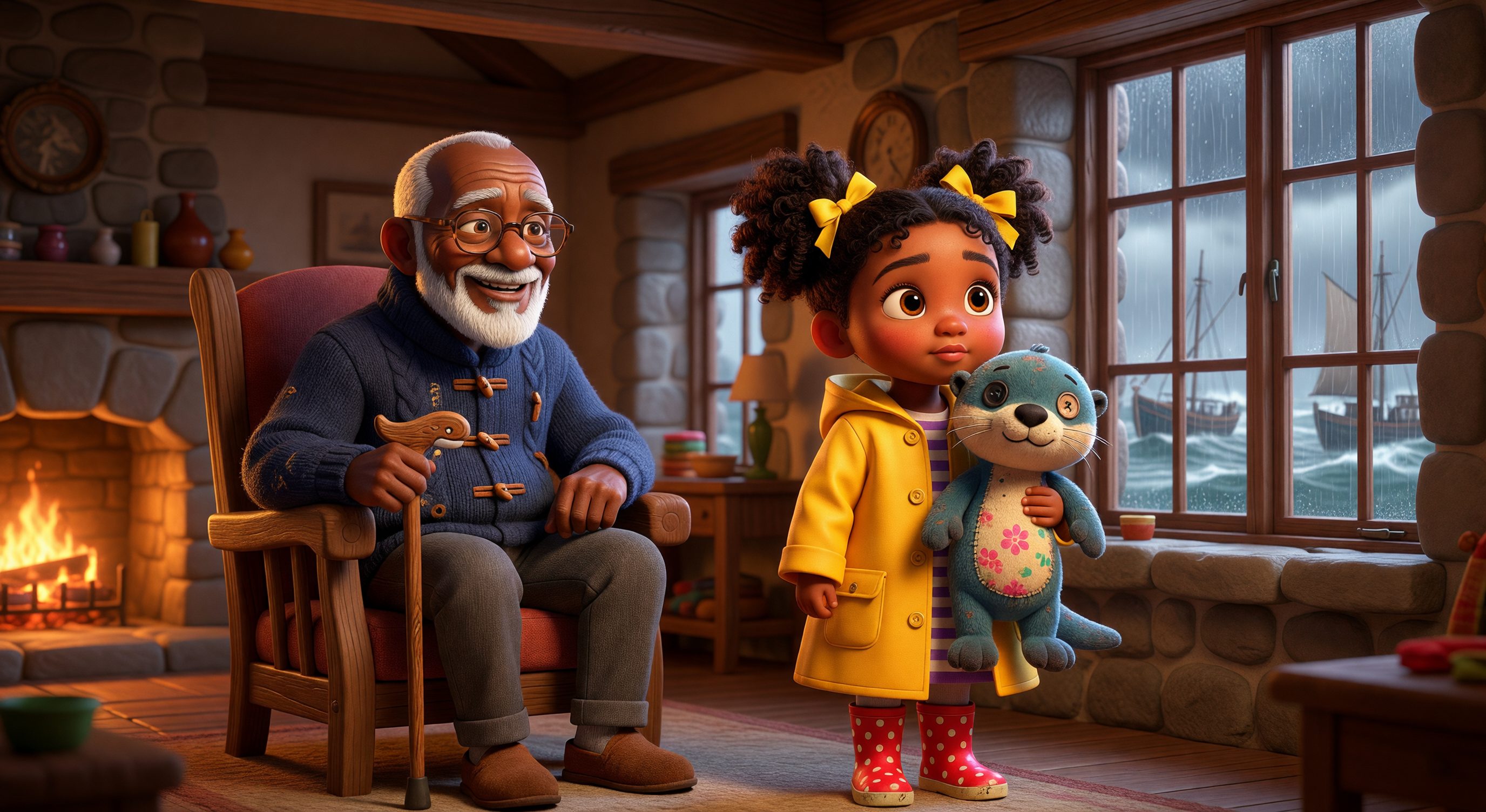 - Papa Gus — grandfather: A kind elderly grandfather with dark brown skin, short silver-white hair, deep warm crinkled dark eyes behind round tortoiseshell glasses, a gentle wide smile with laugh lines, a short silver beard. Wearing a thick navy-blue cable-knit fisherman's sweater with wooden toggle buttons, gray wool trousers, brown leather slippers at home. Walks with a carved wooden cane with a whale handle.