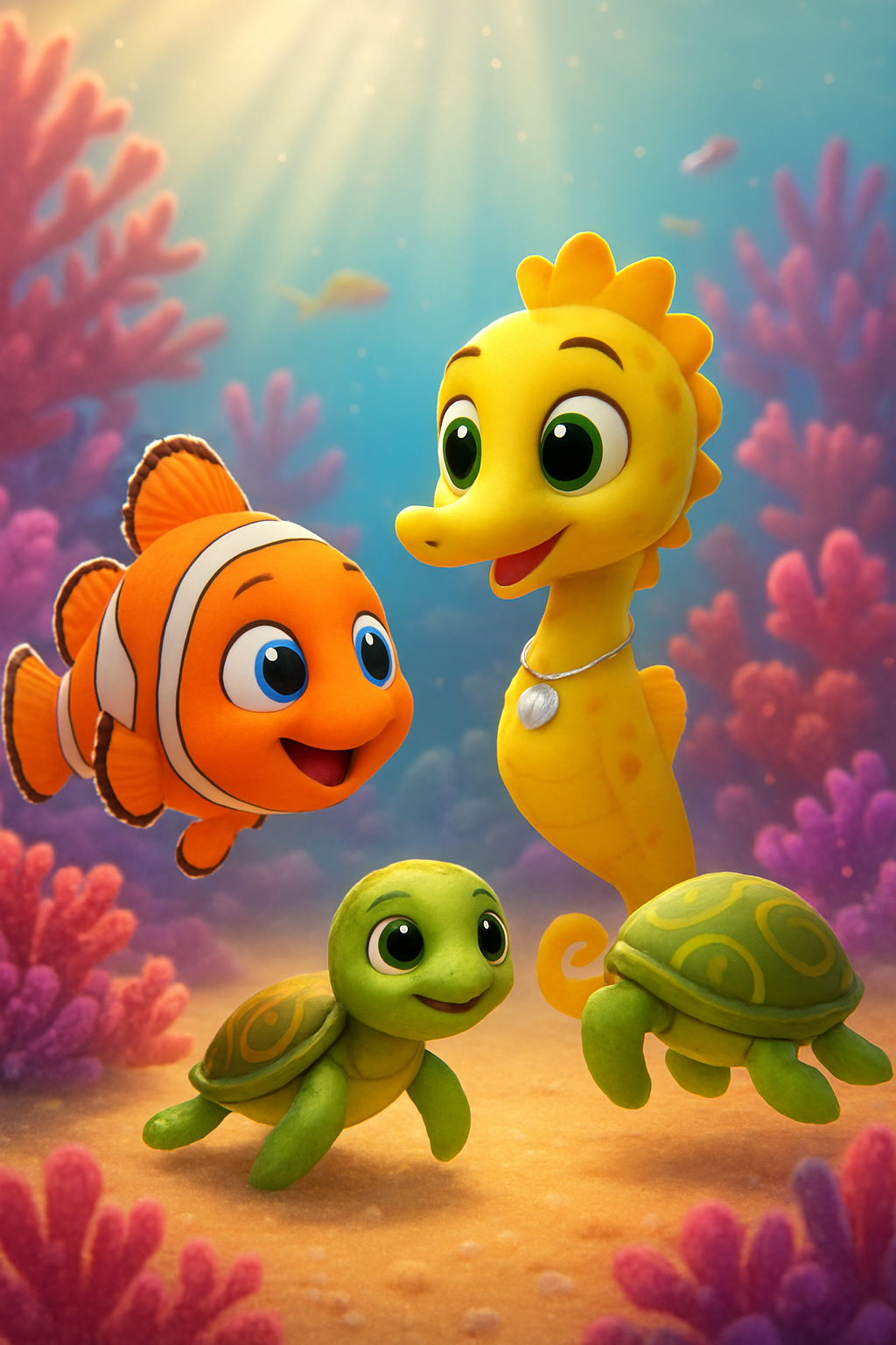 Scene 1: Ollie zooms past twisty corals. "Tag, Suki—you're it!" They giggle and chase bubbles.