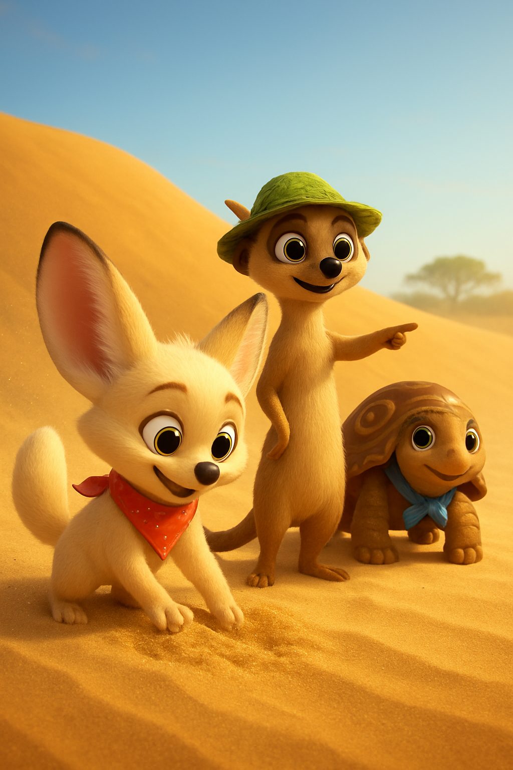 Scene 1: Finn, Miko, and Tilly want the biggest dune fort ever. Finn digs super fast with his paws. Uh-oh, sand starts to rumble!