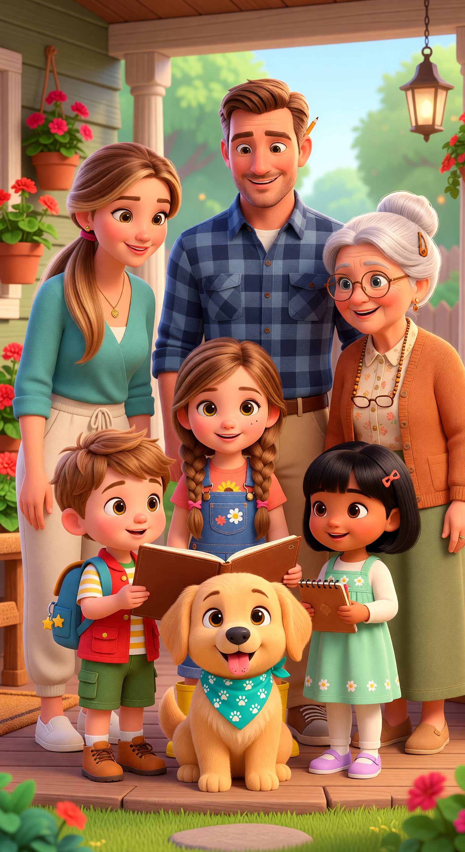 - Jack — father: A tall, athletic father with light fair skin, short neat sandy-brown hair like his children, warm hazel eyes, light stubble on his jaw, and a friendly wide smile. Wearing a navy-blue plaid flannel shirt with rolled-up sleeves, khaki pants, brown leather belt, and rugged canvas sneakers. Has a pencil tucked behind his right ear.