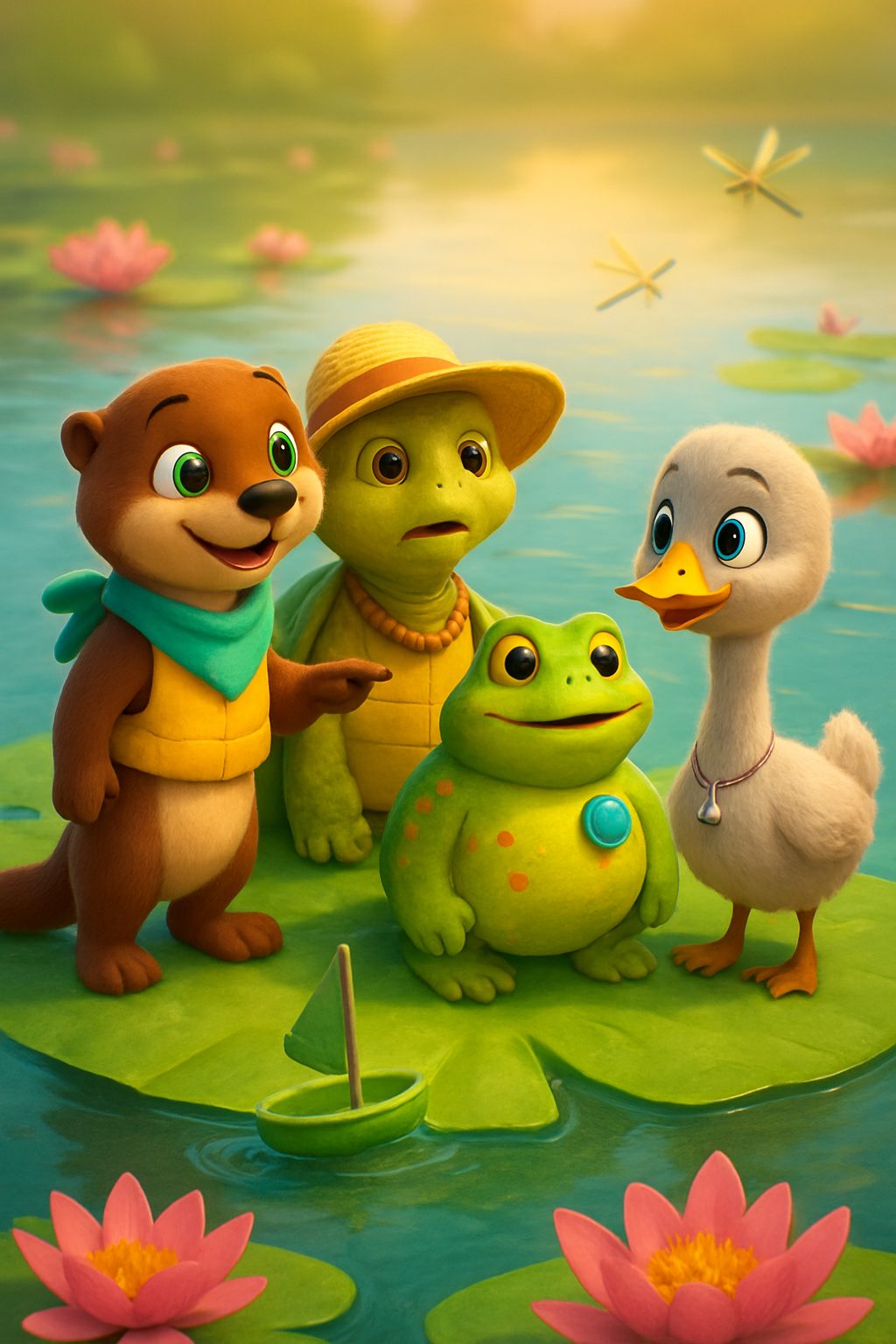 Setting: A sparkling pond and winding riverside on a warm summer morning, with blooming water lilies, swaying reeds, gentle currents, dragonflies buzzing, and sunlight shimmering on the rippling blue water