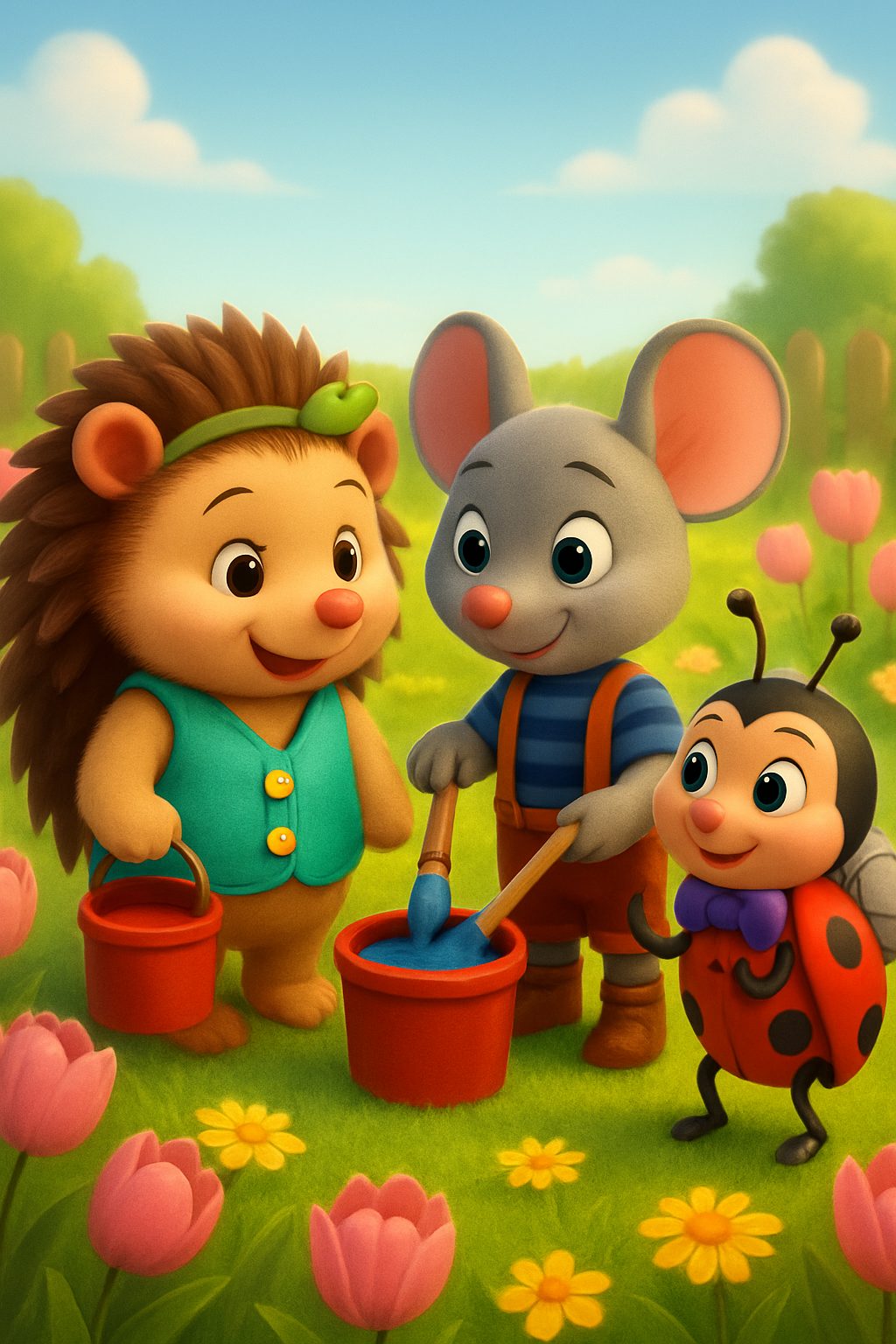 Scene 1: Hazel, Benny, and Lola love their garden home. Today they paint rocks for a big flower party. 'Let's mix colors bright!' says Hazel.