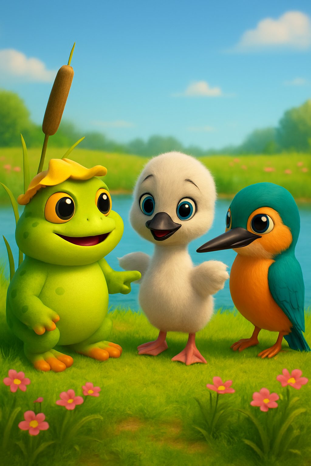 Setting: A sparkling riverside pond on a warm spring morning, with floating lily pads, swaying green reeds, overhanging willow branches, and sunlight shimmering on gentle blue ripples