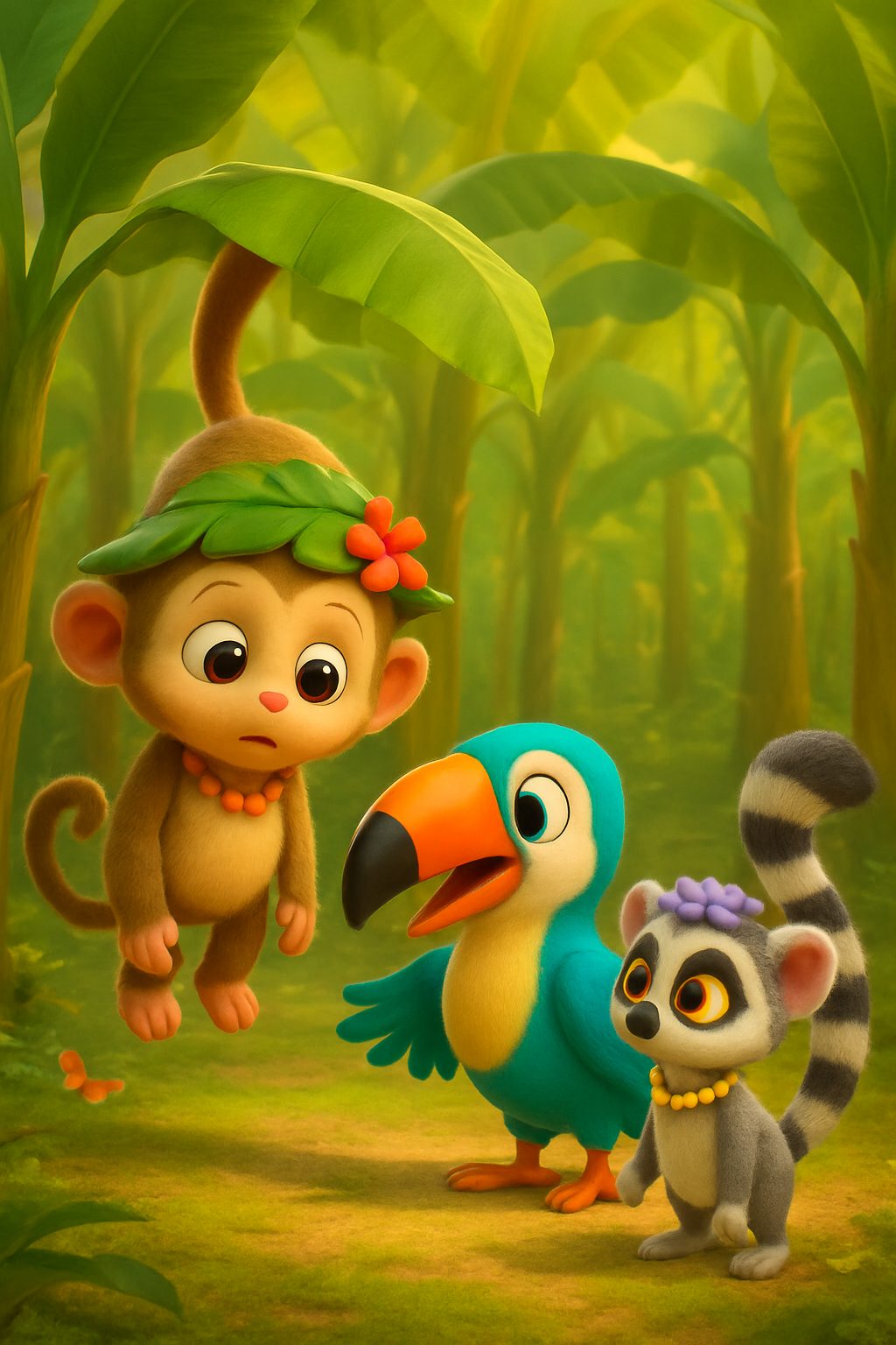 Scene 1: Miko swings from a branch. 'Where are all the bananas?' Tiko squawks. Lila sniffs the air. Something sticky is wrong!