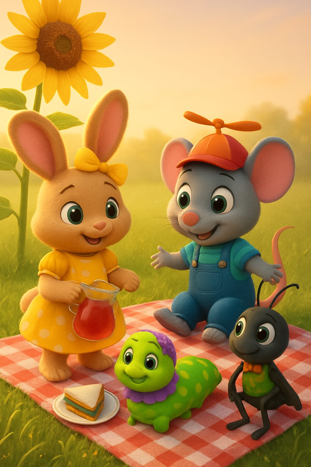 Scene 1: Pippa, Monty, Carla, and Ricky plan the best garden picnic ever. Pippa hops with a big jug of sweet red berry juice. 'This will be yummy!' she giggles.